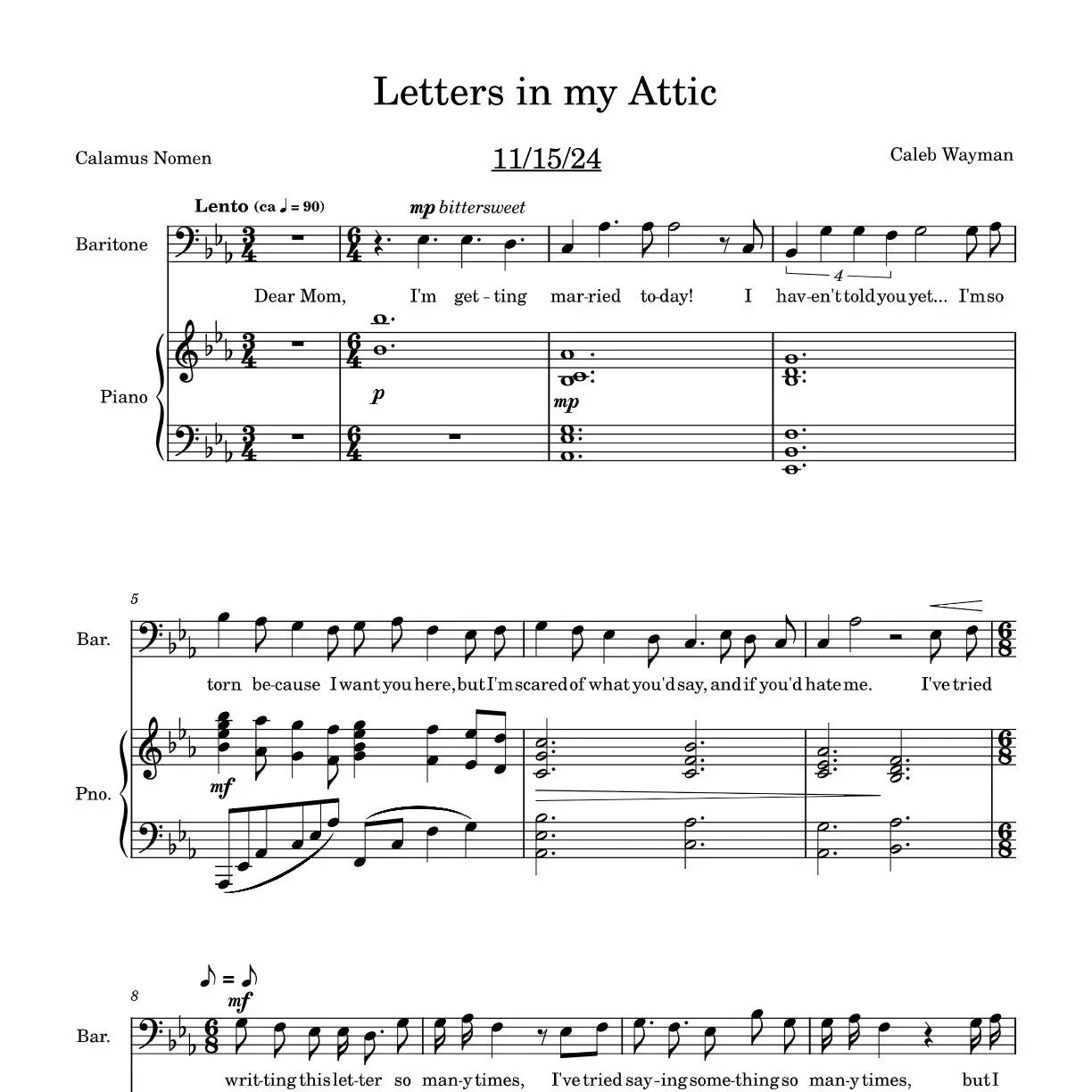 For baritone (Bb2-F4) and piano, Letters Lost in my Attic is a through composed piece structured as several letters that the author is revisiting or reliving. The letters tell a story of heartache and loss and the pains of a child struggling to come out to their mother.